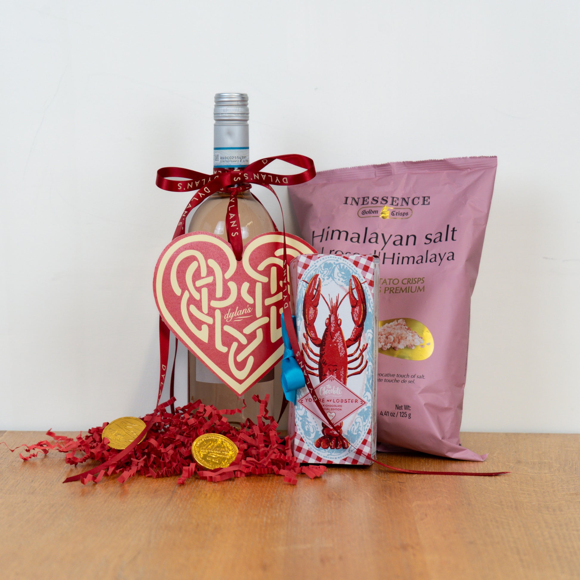 Celebrate love with our Blush & Bites Hamper - a thoughtfully curated gift for two. This romantic collection features a Himalayan salt sharing bag of crisps for savoury indulgence, a gift-wrapped chocolate lobster for a touch of whimsy, and a bottle of Pinot grigio blush to toast the occasion. Finished with Dylan's chocolate coins and a paper heart keepsake where you can pen your own message, it's the perfect blend of treats, elegance, and personal sentiment. Ideal for Valentine's Day or any celebration worth sharing.