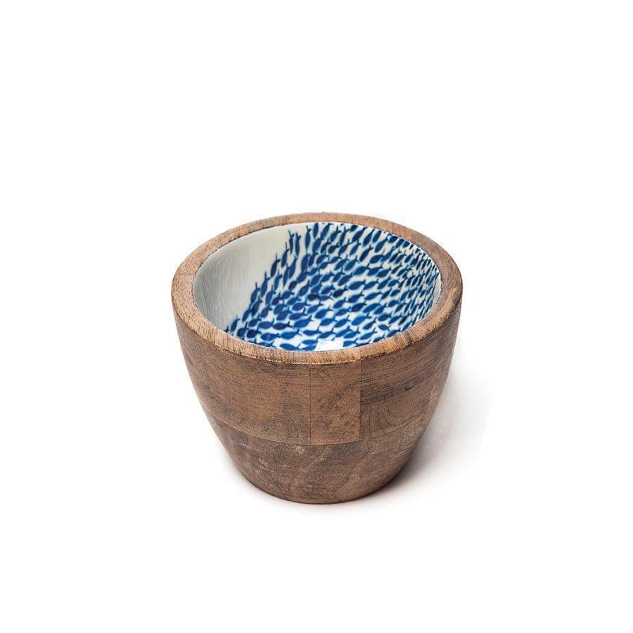 Part of the fabulous sustainable mango wood range from Shoeless Joe. This fabulous little bowl is made from mango wood with a fused enamelled decal interior with a fish shoal design.